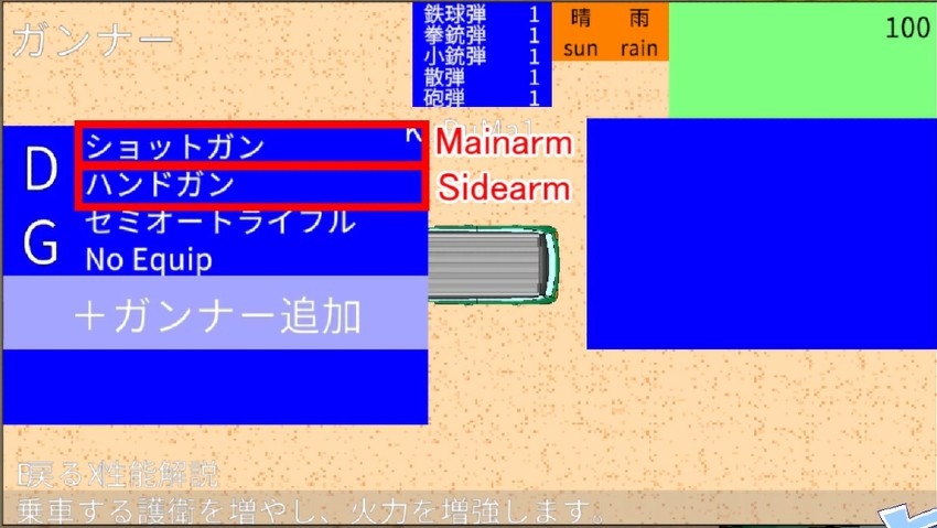 プレイヤーやガンナーはそれぞれメインアームとサイドアームを装備でき、それらを交互に切り替えられます。