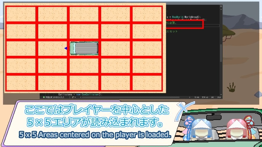 まずプレイヤーを中心とした5×5エリアが読み込まれます。